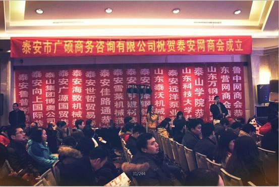 2015年1月26日,泰安市網(wǎng)商協(xié)會成立大會在泰安寶龍福朋酒店隆重舉行。參會的有泰安市政府領(lǐng)導(dǎo)、泰山區(qū)區(qū)委書記和阿里巴巴北方區(qū)域、泰安市商務(wù)局、泰山區(qū)商務(wù)局、市建行、泰山學院、山東科技大學、市外網(wǎng)商會等多家單位的主要領(lǐng)導(dǎo)以及泰安網(wǎng)商會全體會員。